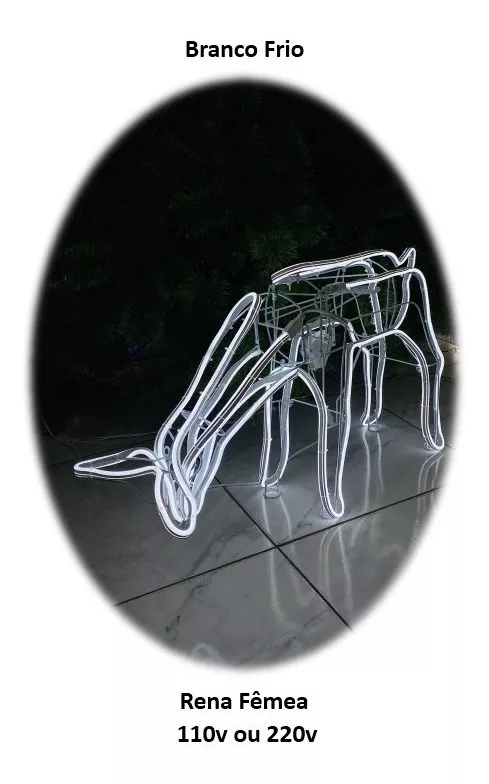 Modelo de Rena neon. As mangueiras neon são cores mais fortes, vivas e vibrantes. Tem um grande destaque nas decorações externas ou internas, se preferir, tem movimento. Tem como função única a fixa, é bem resistente e pode durar anos, se tomar todos os cuidados e manter em lugar seguro quando não é usado.