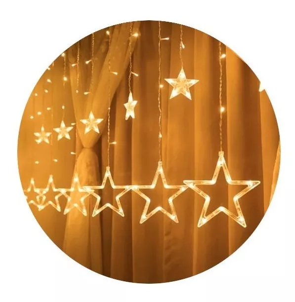 Este produto é recomendado para: Casas, fachadas, lojas, shopping centers, vitrines, etc.CARACTERÍSTICAS:- Código: 81658.- Quantidade de LED: 138.- Modo LED: 8 Funções.- Cor Luz do LED: Branco Quente.- Cor do Fio: Transparente.- Voltagem: 220V.- Peças: 6 estrelas pequenas e 6 estrelas grandes.- Tomada: Macho e Fêmea.