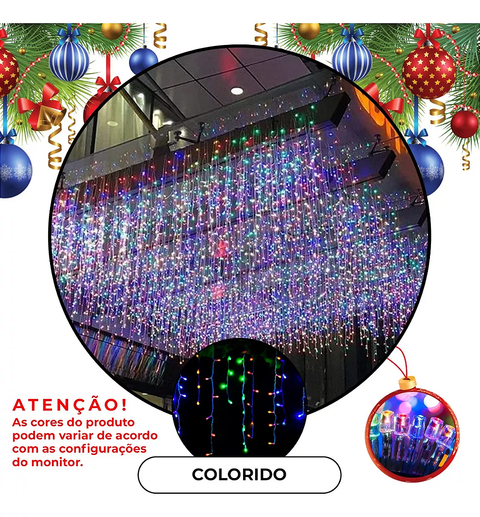 A Cascata De Natal 100 LEDS Luz Colorida 8 Funções tomada macho / fêmea 3,00m 220V, Ideal para todo tipo de decoração; O produto mais utilizado por arquitetos e decoradores para decorar casas, fachadas, lojas, prédios residenciais e comercio de todo o Brasil.