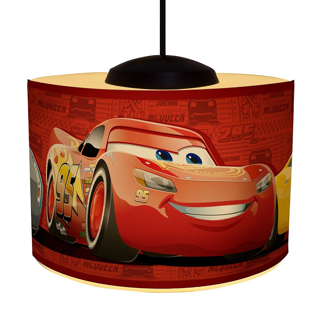Licenciamento exclusivo da RT Iluminação com a Disney Pixar, a Luminária pendente Carros, produzida em polietileno com capa em polipropileno impresso, é a iluminação de teto perfeita para o quarto dos pequenos fãs de Relâmpago McQueen.