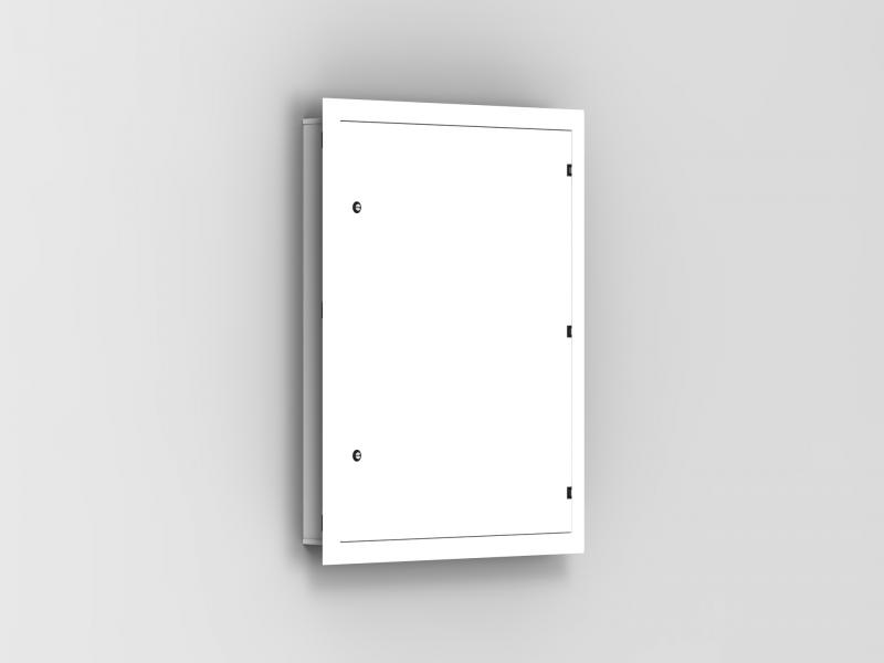 Quadro de comando modelo de embutir. O quadro é constituído pelas partes: caixa, placa de montagem e porta com moldura.